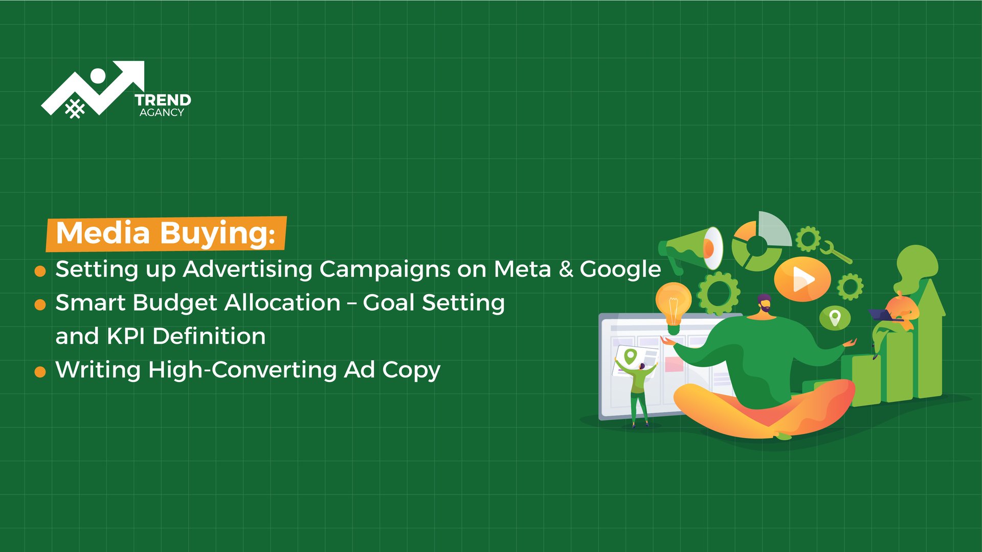 3 أقسام مكثفة: Content Creation، Media Buying، SEO & Google Ads